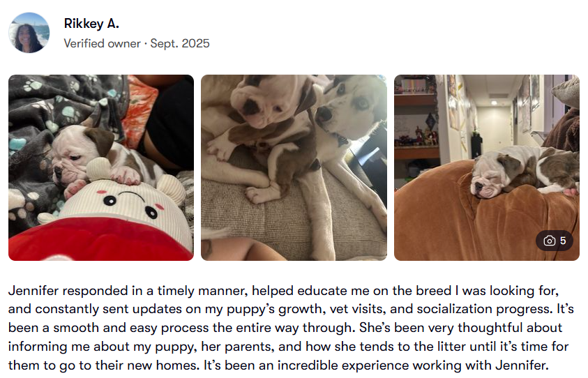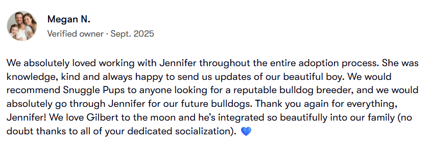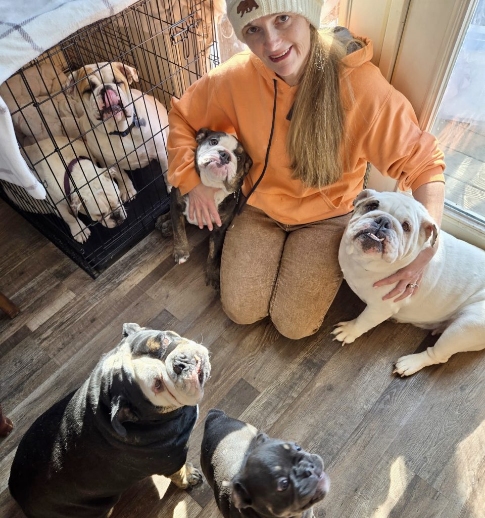 I grew up with a deep love for all animals. I had aspirations as many children do, of being a vet. In my early 20s, I was introduced to a Jack Russell Terrier. This began my love for dogs in general and was the starting point of breeding and training wonderful family pets. 10 yrs later I rescused an English Bulldog from the shelter and instantly fell in love with my first wrinkle dog. Walter was approximately 5 when he reached his final home with us. He was the mascot and the calm in our storm of 8 children. He never had a harsh word or even a gruff when visitors came to call. Walter had no training or tricks but was a most loved addition to our home, unfortunately he passed away. We decided to rescue another Bully a year later. Bulldozer, was an amazing example of the breed standard in confirmation. His size and stature was just amazing; but he suffered from terrible snoring, allergies, and skin infections. He and Walter were examples of irresponsible breeding practices, sadly they both only lived a few years with our family before passing away from genetic related diseases. I was heartbroken and wanted a better quality of life for this beloved breed. I also wanted more time with my companions, who had given so much peace and joy to our home. I spent the next few years searching for a new Bulldog puppy. My goal was a healthier Bully requiring fewer vet visits and just a better quality of life, free from dysplasia pain, diseases and skin irritaions. I spent lots of time researching breeders to find Lilly. She was the most obedient pup I have ever raised. She spent her first year following my now adult children to their jobs at the local kennel. She became part of the staff there as a training animal for other dogs who displayed aggression and fear. Lilly was the calm in their storm. Over the next 2 years I dove into understanding genetics and how it affects health. I partnered with fellow top-tier, reputable breeders with Champion Bloodlines to build my own premier bloodline. We use Embark testing and perfectly matched our Dam’s with their Sire’s to produce Show Quality healthy, and genetically clean and lovable pups. Our Snuggle Pups have been exemplary and proven to be as lovable as they come. We are not just breeding for the “Breed Standard” we are breeding for Excellence in the Breed! Click the link below to view our current availalbe pups.