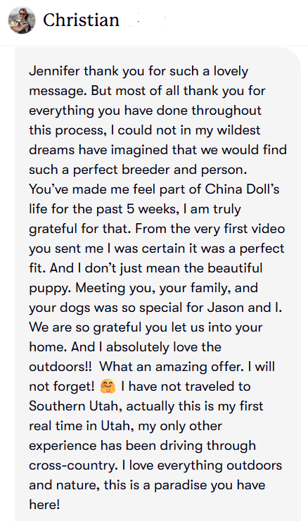 Athena is our newest addition. She is a large and beautiful female pup. Her coat is soft, with a very unique color palat. She is very sweet and LOVES to snuggle! we look forward to her future pups.