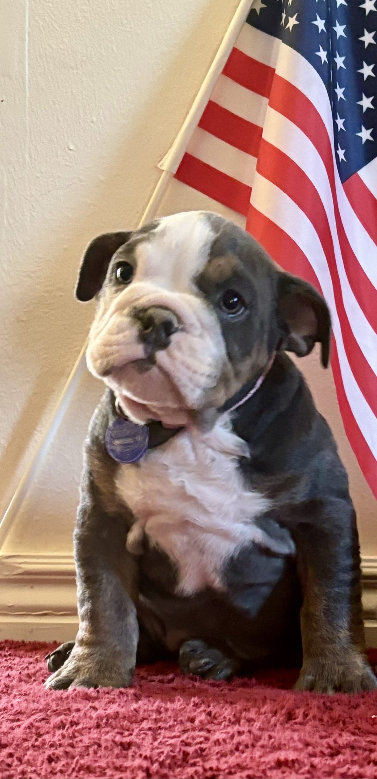 Hooch, Male, Blue Tri Brindle. This sweet baby was from our previous litter. See him all grown up.